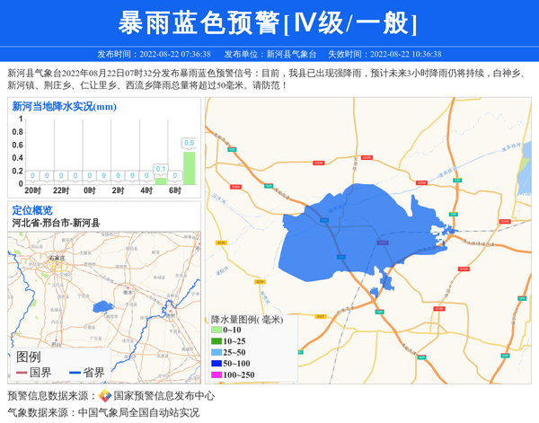 新河县气象台2022年08月22日07时32分发布暴雨蓝色预警信号:目前,我县已出现强降雨,预计未来3小时降雨仍将持续,白神乡、新河镇、荆庄乡、仁让里乡、西流乡降雨总量将超过50毫米。请防范! 信息来源:国家预警信息发布中心; 发布单位:新河县气象台。