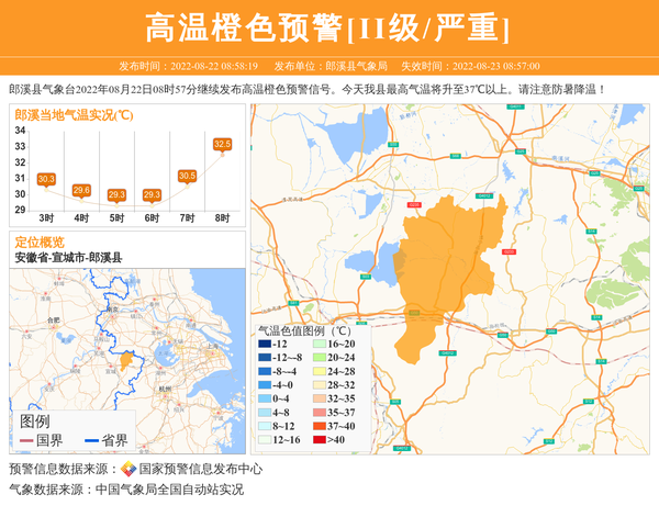 郎溪县气象台2022年08月22日08时57分继续发布高温橙色预警信号。今天我县最高气温将升至37℃以上。请注意防暑降温! 信息来源:国家预警信息发布中心; 发布单位:郎溪县气象局。