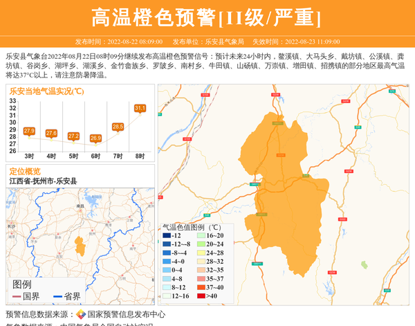 乐安县气象台2022年08月22日08时09分继续发布高温橙色预警信号:预计未来24小时内,鳌溪镇、大马头乡、戴坊镇、公溪镇、龚坊镇、谷岗乡、湖坪乡、湖溪乡、金竹畲族乡、罗陂乡、南村乡、牛田镇、山砀镇、万崇镇、增田镇、招携镇的部分地区最高气温将达37°C以上,请注意防暑降温。 信息来源:国家预警信息发布中心; 发布单位:乐安县气象局。