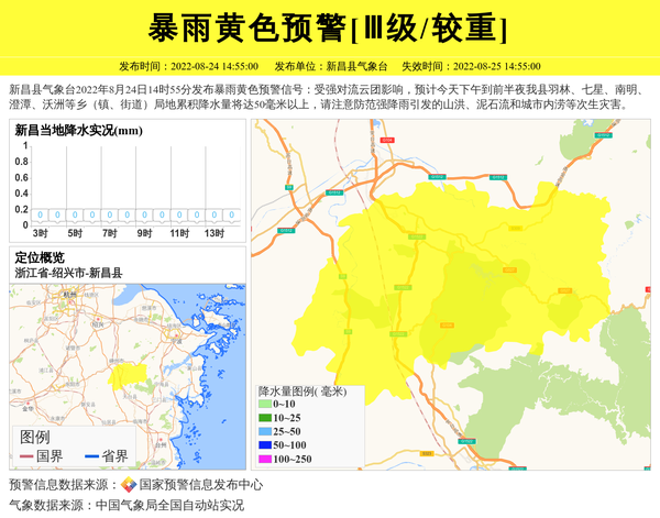 新昌县气象台2022年8月24日14时55分发布暴雨黄色预警信号:受强对流云团影响,预计今天下午到前半夜我县羽林、七星、南明、澄潭、沃洲等乡(镇、街道)局地累积降水量将达50毫米以上,请注意防范强降雨引发的山洪、泥石流和城市内涝等次生灾害。 信息来源:国家预警信息发布中心; 发布单位:新昌县气象台。