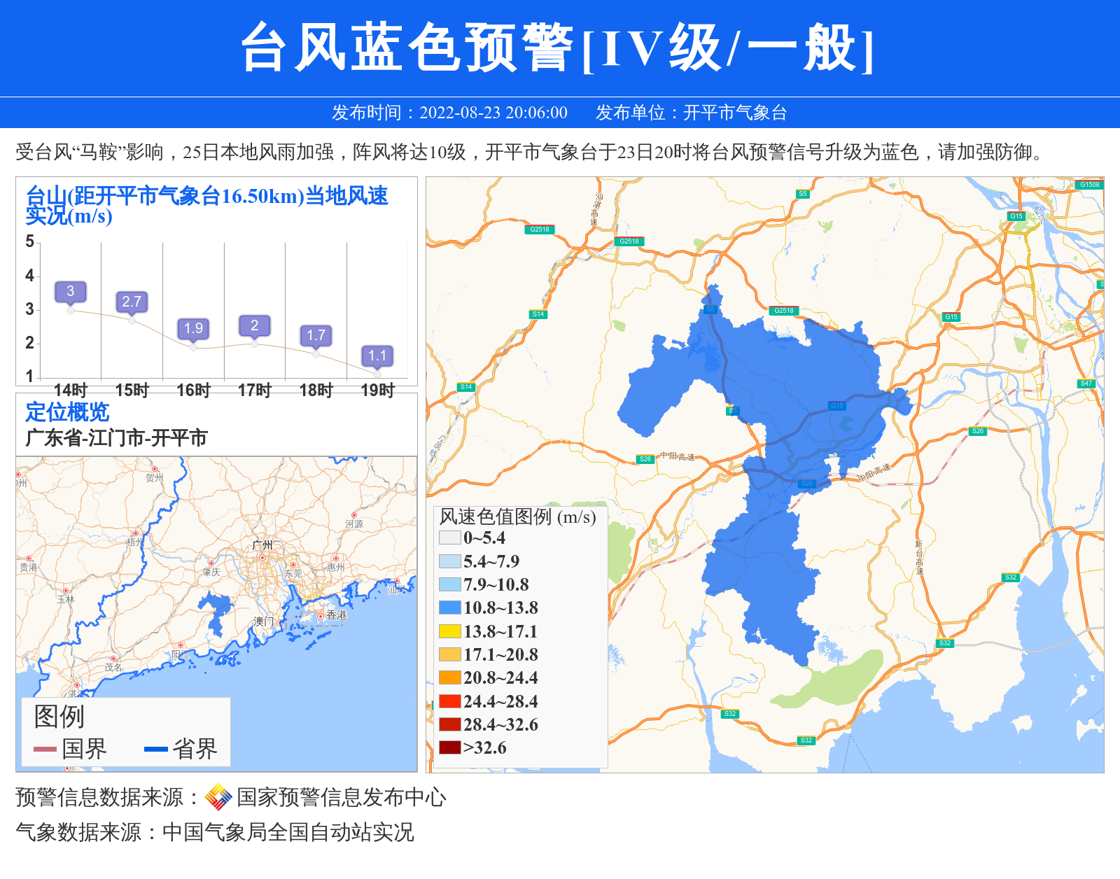 受台风“马鞍”影响,25日本地风雨加强,阵风将达10级,开平市气象台于23日20时将台风预警信号升级为蓝色,请加强防御。 信息来源:国家预警信息发布中心; 发布单位:开平市气象台。