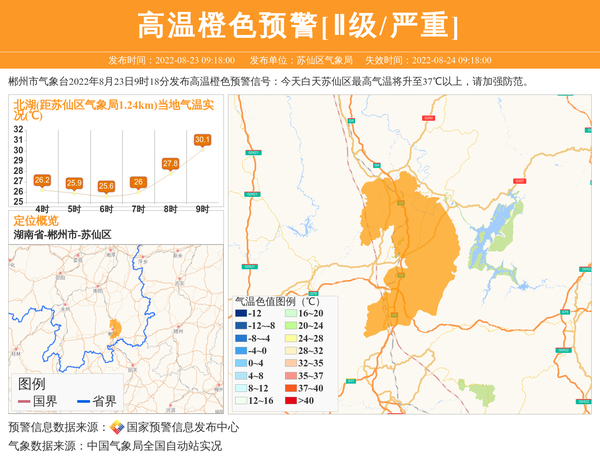 郴州市气象台2022年8月23日9时18分发布高温橙色预警信号:今天白天苏仙区最高气温将升至37℃以上,请加强防范。 信息来源:国家预警信息发布中心; 发布单位:苏仙区气象局。