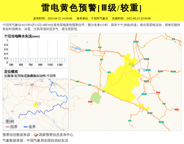 个旧市气象台2022年8月23日14时50分发布雷电黄色预警信号:预计未来6小时,我市十个乡镇(街道)将出现雷电活动,局地可能伴有短时强降水、冰雹、大风等强对流天气,请注意防范。 信息来源:国家预警信息发布中心; 发布单位:个旧市气象台。