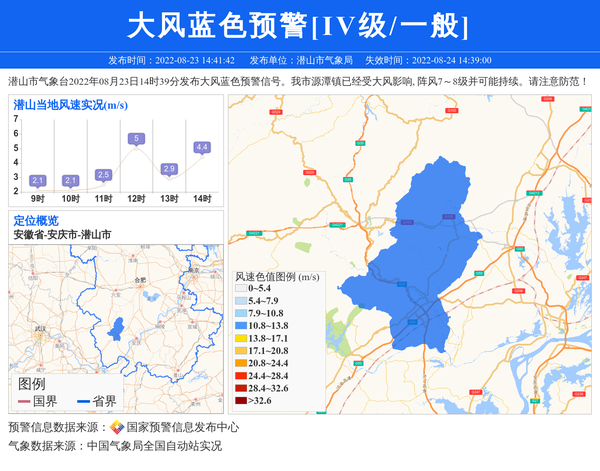 潜山市气象台2022年08月23日14时39分发布大风蓝色预警信号。我市源潭镇已经受大风影响, 阵风7~8级并可能持续。请注意防范! 信息来源:国家预警信息发布中心; 发布单位:潜山市气象局。