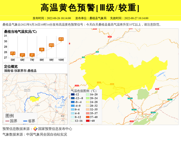 桑植县气象台2022年8月26日10时14分发布高温黄色预警信号:今天白天桑植县最高气温将升至35℃以上,请注意防范。 信息来源:国家预警信息发布中心; 发布单位:桑植县气象局。