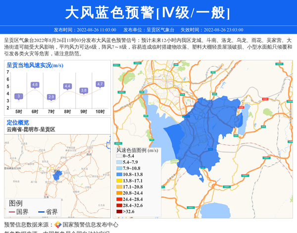 呈贡区气象台2022年8月26日11时03分发布大风蓝色预警信号:预计未来12小时内我区龙城、斗南、洛龙、乌龙、雨花、吴家营、大渔街道可能受大风影响,平均风力可达6级,阵风7~8级,容易造成临时搭建物吹落、塑料大棚轻质屋顶破损、小型水面船只倾覆和引发各类火灾等危害,请注意防范。 信息来源:国家预警信息发布中心; 发布单位:呈贡区气象台。