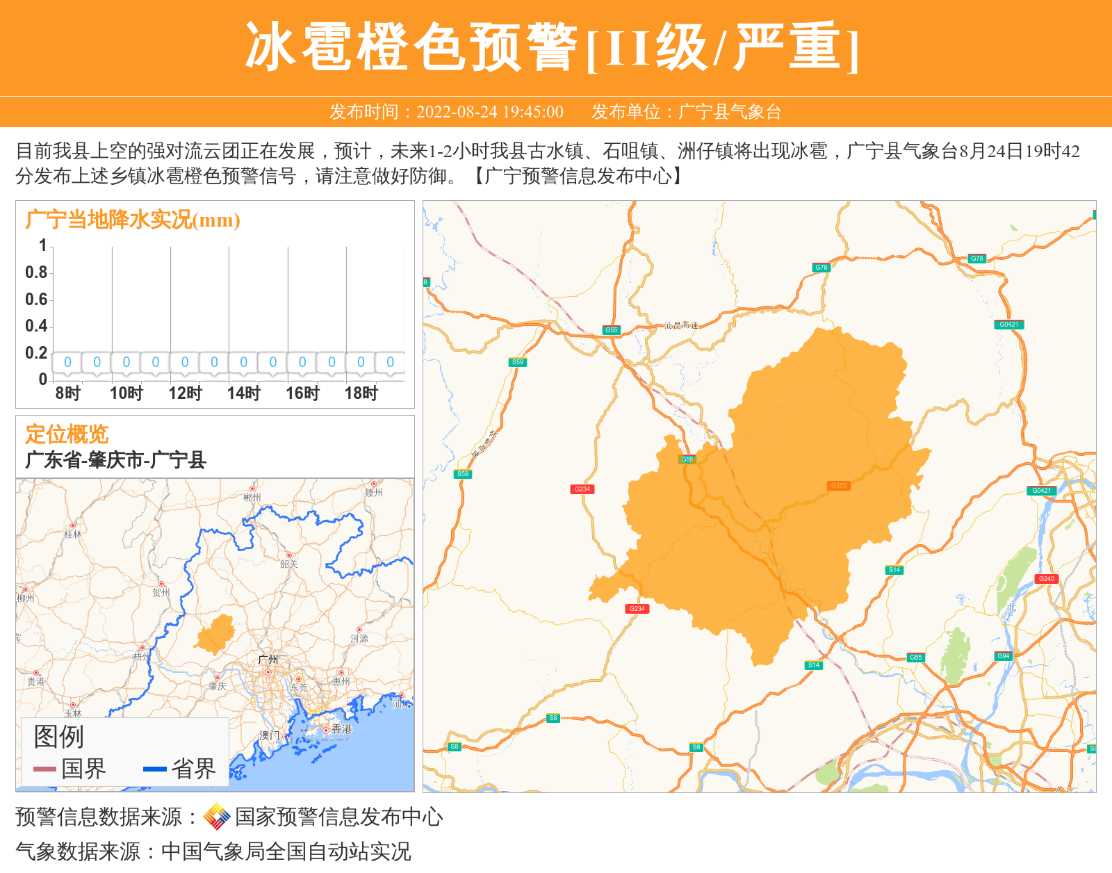 目前我县上空的强对流云团正在发展,预计,未来1-2小时我县古水镇、石咀镇、洲仔镇将出现冰雹,广宁县气象台8月24日19时42分发布上述乡镇冰雹橙色预警信号,请注意做好防御。【广宁预警信息发布中心】 信息来源:国家预警信息发布中心; 发布单位:广宁县气象台。