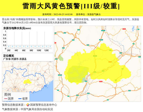 受台风“马鞍”外围螺旋雨带影响,预计未来三小时,我县雷雨频繁,局部伴有雷电、短时大风和短时强降水等强对流天气,东源县气象台于2022年08月25日14时00分发布东源雷雨大风黄色预警信号,请注意防御。 信息来源:国家预警信息发布中心; 发布单位:东源县气象台。