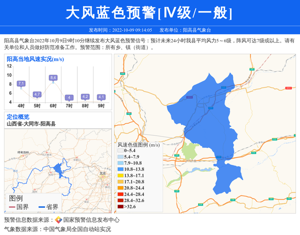 阳高县气象台2022年10月9日9时10分继续发布大风蓝色预警信号:预计未来24小时我县平均风力5~6级,阵风可达7级或以上。请有关单位和人员做好防范准备工作。预警范围:所有乡、镇(街道)。 信息来源:国家预警信息发布中心; 发布单位:阳高县气象台。