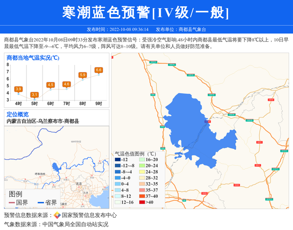 商都县气象台2022年10月08日09时33分发布寒潮蓝色预警信号:受强冷空气影响.48小时内商都县最低气温将要下降8℃以上,10日早晨最低气温下降至-9~-6℃,平均风力6~7级,阵风可达8~10级。请有关单位和人员做好防范准备。 信息来源:国家预警信息发布中心; 发布单位:商都县气象台。
