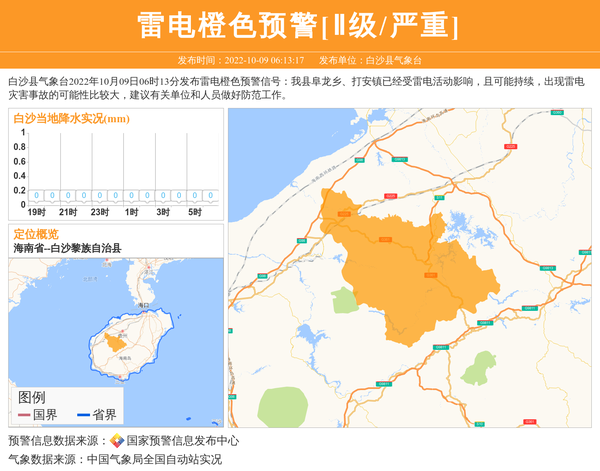 白沙县气象台2022年10月09日06时13分发布雷电橙色预警信号:我县阜龙乡、打安镇已经受雷电活动影响,且可能持续,出现雷电灾害事故的可能性比较大,建议有关单位和人员做好防范工作。 信息来源:国家预警信息发布中心; 发布单位:白沙县气象台。