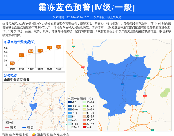 临县气象局2022年10月7日16时25分发布霜冻蓝色预警信号,预警区域:所有乡、镇(街道)。受较强冷空气影响,预计48小时内预警区域地面最低温度将下降到0℃以下,请相关单位和人员注意防范。防御指南:1.政府及农林主管部门按照职责做好防霜冻准备工作;2.对农作物、蔬菜、花卉、瓜果、林业育种要采取一定的防护措施;3.农村基层组织和农户要关注当地霜冻预警信息,以便采取措施加强防护。 信息来源:国家预警信息发布中心; 发布单位:临县气象局。