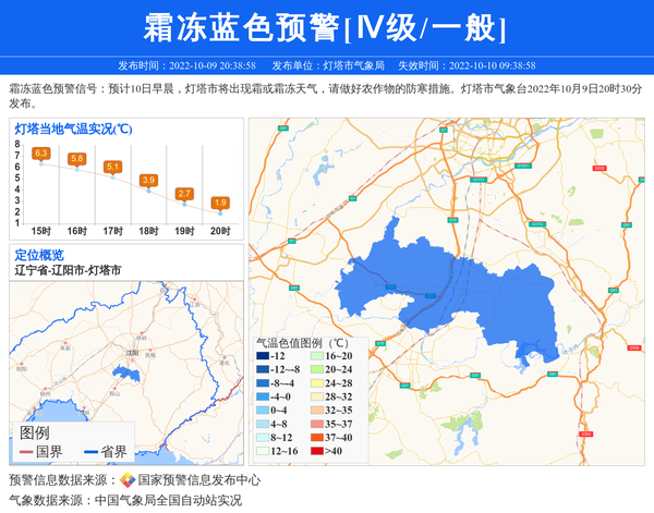 霜冻蓝色预警信号:预计10日早晨,灯塔市将出现霜或霜冻天气,请做好农作物的防寒措施。灯塔市气象台2022年10月9日20时30分发布。 信息来源:国家预警信息发布中心; 发布单位:灯塔市气象局。
