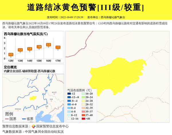西乌珠穆沁旗气象台2022年10月09日17时28分发布道路结冰黄色预警信号:12小时内西乌珠穆沁旗有对交通有影响的道路积雪或结冰。请有关单位和人员做好防范准备。 信息来源:国家预警信息发布中心; 发布单位:西乌珠穆沁旗气象台。