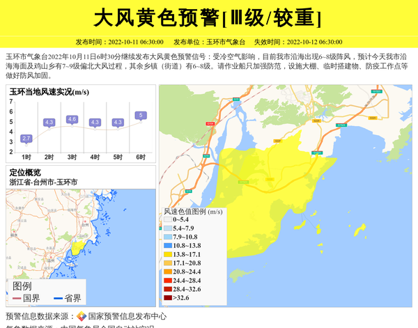 玉环市气象台2022年10月11日6时30分继续发布大风黄色预警信号:受冷空气影响,目前我市沿海出现6~8级阵风,预计今天我市沿海海面及鸡山乡有7~9级偏北大风过程,其余乡镇(街道)有6~8级。请作业船只加强防范,设施大棚、临时搭建物、防疫工作点等做好防风加固。 信息来源:国家预警信息发布中心; 发布单位:玉环市气象台。