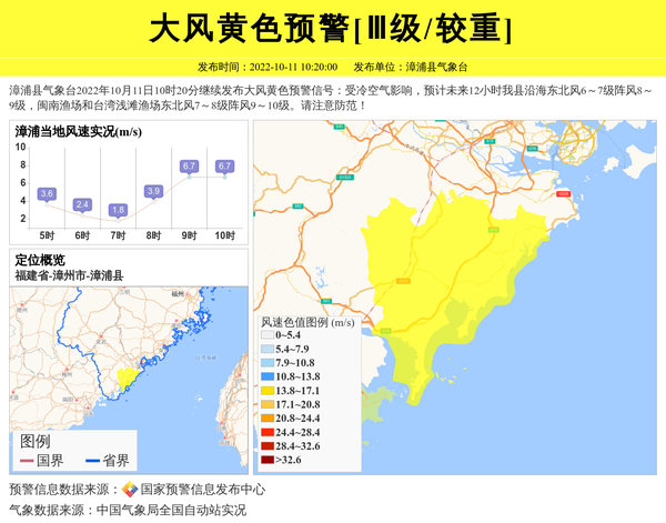 漳浦县气象台2022年10月11日10时20分继续发布大风黄色预警信号:受冷空气影响,预计未来12小时我县沿海东北风6~7级阵风8~9级,闽南渔场和台湾浅滩渔场东北风7~8级阵风9~10级。请注意防范! 信息来源:国家预警信息发布中心; 发布单位:漳浦县气象台。