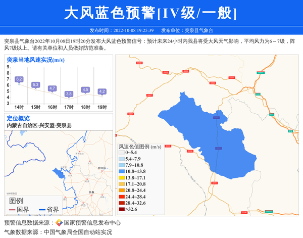突泉县气象台2022年10月08日19时20分发布大风蓝色预警信号:预计未来24小时内我县将受大风天气影响,平均风力为6~7级,阵风7级以上。请有关单位和人员做好防范准备。 信息来源:国家预警信息发布中心; 发布单位:突泉县气象台。