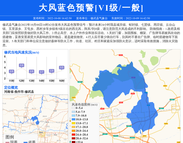 修武县气象台发布大风蓝色预警[VI级/一般]