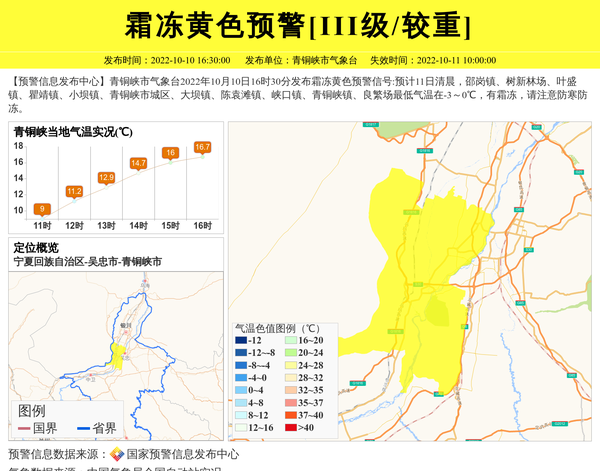 【预警信息发布中心】青铜峡市气象台2022年10月10日16时30分发布霜冻黄色预警信号:预计11日清晨,邵岗镇、树新林场、叶盛镇、瞿靖镇、小坝镇、青铜峡市城区、大坝镇、陈袁滩镇、峡口镇、青铜峡镇、良繁场最低气温在-3~0℃,有霜冻,请注意防寒防冻。 信息来源:国家预警信息发布中心; 发布单位:青铜峡市气象台。