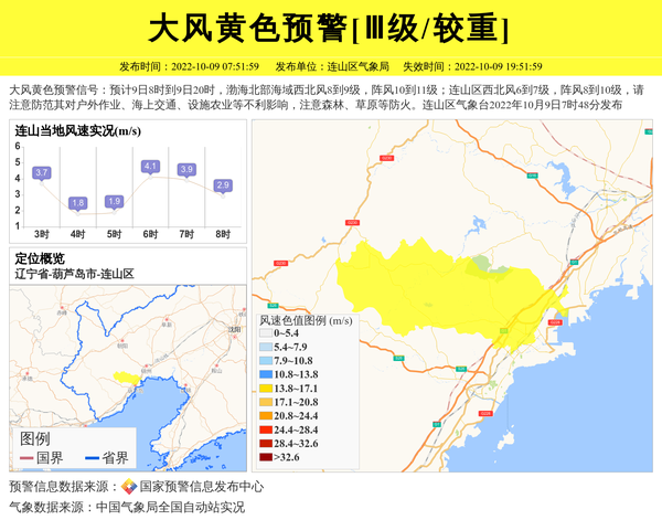 大风黄色预警信号:预计9日8时到9日20时,渤海北部海域西北风8到9级,阵风10到11级;连山区西北风6到7级,阵风8到10级,请注意防范其对户外作业、海上交通、设施农业等不利影响,注意森林、草原等防火。连山区气象台2022年10月9日7时48分发布 信息来源:国家预警信息发布中心; 发布单位:连山区气象局。