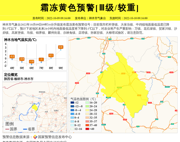 神木市气象台2022年10月09日09时16分升级发布霜冻黄色预警信号:目前我市栏杆堡镇、大保当镇、中鸡镇地面最低温度已降到-3℃以下,预计下述地区未来24小时内地面最低温度将下降到-3℃以下,对农业将产生严重影响:万镇、花石崖镇、贺家川镇、沙峁镇、高家堡镇、马镇、锦界镇、麟州街道、尔林兔镇、店塔镇、孙家岔镇、大柳塔试验区,请注意防范。 信息来源:国家预警信息发布中心; 发布单位:神木市气象台。