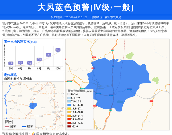 霍州市气象台2022年10月9日10时28分发布继续大风蓝色预警信号,预警区域:所有乡、镇(街道)。预计未来24小时预警区域有平均风力4~6级、阵风7级以上西北风。请有关单位和人员做好防范准备。 防御指南: 1.政府及相关部门按照职责做好防大风工作; 2.关好门窗,加固围板、棚架、广告牌等易被风吹动的搭建物,妥善安置易受大风影响的室外物品,遮盖建筑物资; 3.行人注意尽量少骑自行车,刮风时不要在广告牌、临时搭建物等下面逗留; 4.有关部门和单位注意森林、草原等防火。 信息来源:国家预警信息发布中心; 发布单位:霍州市气象局。