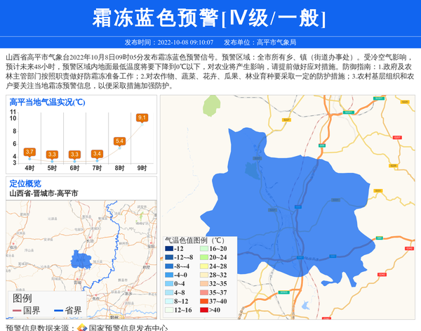 山西省高平市气象台2022年10月8日09时05分发布霜冻蓝色预警信号。预警区域:全市所有乡、镇(街道办事处)。受冷空气影响,预计未来48小时,预警区域内地面最低温度将要下降到0℃以下,对农业将产生影响,请提前做好应对措施。防御指南:1.政府及农林主管部门按照职责做好防霜冻准备工作;2.对农作物、蔬菜、花卉、瓜果、林业育种要采取一定的防护措施;3.农村基层组织和农户要关注当地霜冻预警信息,以便采取措施加强防护。 信息来源:国家预警信息发布中心; 发布单位:高平市气象局。