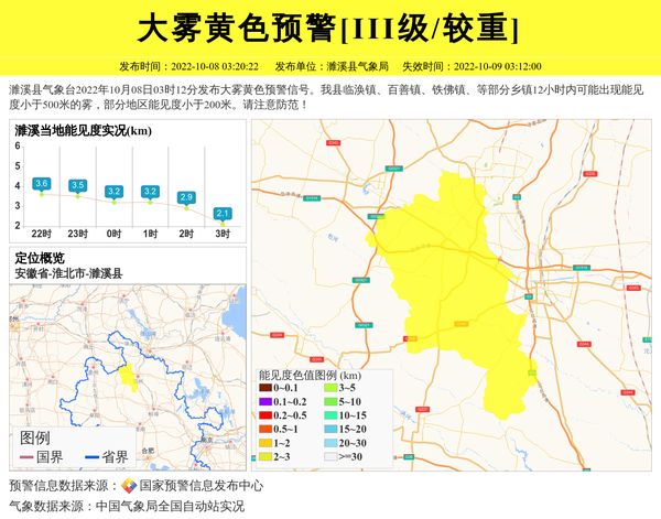 濉溪县气象台2022年10月08日03时12分发布大雾黄色预警信号。我县临涣镇、百善镇、铁佛镇、等部分乡镇12小时内可能出现能见度小于500米的雾,部分地区能见度小于200米。请注意防范! 信息来源:国家预警信息发布中心; 发布单位:濉溪县气象局。