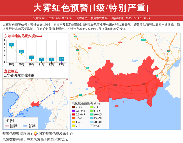 大雾红色预警信号:预计未来2小时,东港市及其沿岸海域将出现能见度小于50米的强浓雾天气,请注意防范强浓雾对交通运输、海上航行带来的恶劣影响,停止户外及海上活动。东港市气象台2022年10月14日23时39分发布 信息来源:国家预警信息发布中心; 发布单位:东港市气象局。