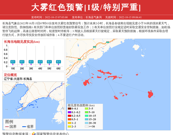 长海县气象台2022年10月15日07时03分发布大雾红色预警信号:预计未来2小时,长海县各镇将出现能见度小于50米的强浓雾天气,请注意防范。防御指南1.有关部门和单位按照职责做好防雾应急工作;2.有关单位按照行业规定适时采取交通安全管制措施,如机场暂停飞机起降,高速公路暂时封闭,轮渡暂时停航等;3.驾驶人员根据雾天行驶规定,采取雾天预防措施,根据环境条件采取合理行驶方式,并尽快寻找安全停放区域停靠;4.不要进行户外活动。 信息来源:国家预警信息发布中心; 发布单位:长海县气象局。