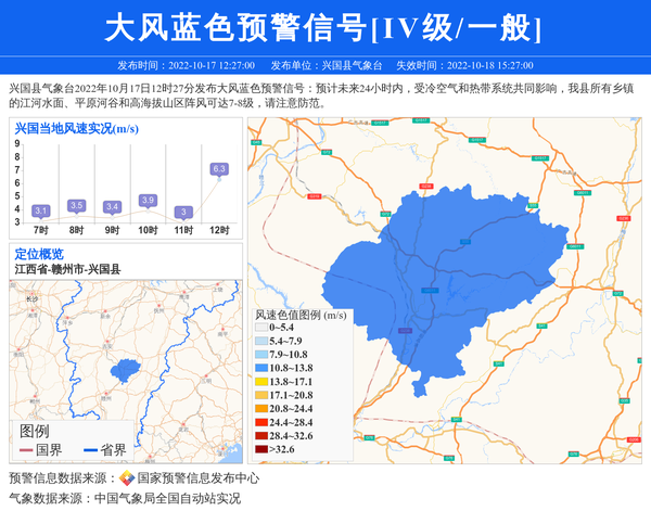 兴国县气象台2022年10月17日12时27分发布大风蓝色预警信号:预计未来24小时内,受冷空气和热带系统共同影响,我县所有乡镇的江河水面、平原河谷和高海拔山区阵风可达7-8级,请注意防范。 信息来源:国家预警信息发布中心; 发布单位:兴国县气象台。