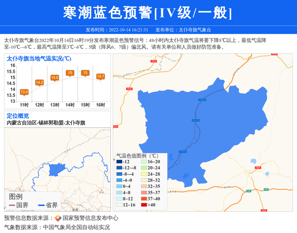 太仆寺旗气象台2022年10月14日16时19分发布寒潮蓝色预警信号:48小时内太仆寺旗气温将要下降8℃以上,最低气温降至-10℃~-6℃,最高气温降至3℃~6℃,5级(阵风6、7级)偏北风。请有关单位和人员做好防范准备。 信息来源:国家预警信息发布中心; 发布单位:太仆寺旗气象台。