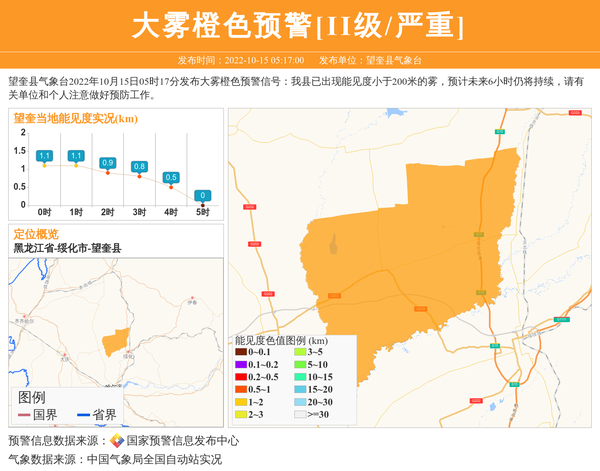 望奎县气象台2022年10月15日05时17分发布大雾橙色预警信号:我县已出现能见度小于200米的雾,预计未来6小时仍将持续,请有关单位和个人注意做好预防工作。 信息来源:国家预警信息发布中心; 发布单位:望奎县气象台。