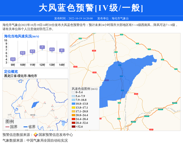 海伦市气象台2022年10月19日14时20分发布大风蓝色预警信号:预计未来24小时我市大部地区有5~6级西南风,阵风可达7~8级,请有关单位和个人注意做好防范工作。 信息来源:国家预警信息发布中心; 发布单位:海伦市气象台。