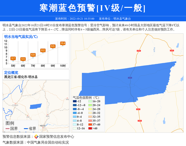 明水县气象台2022年10月21日10时35分发布寒潮蓝色预警信号:受冷空气影响,预计未来48小时我县大部地区最低气温下降8℃以上,22日-23日最低气温将下降至-4~-2℃,降温同时伴有4~5级偏西风,阵风可达7级,请有关单位和个人注意做好预防工作。 信息来源:国家预警信息发布中心; 发布单位:明水县气象台。