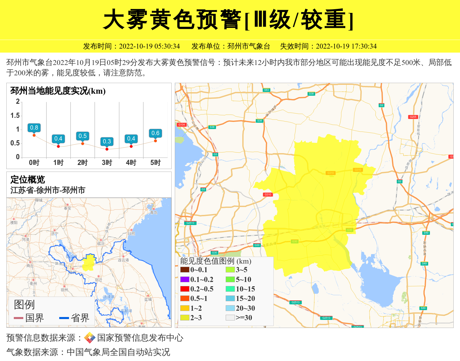 邳州市气象台2022年10月19日05时29分发布大雾黄色预警信号:预计未来12小时内我市部分地区可能出现能见度不足500米、局部低于200米的雾,能见度较低,请注意防范。 信息来源:国家预警信息发布中心; 发布单位:邳州市气象台。