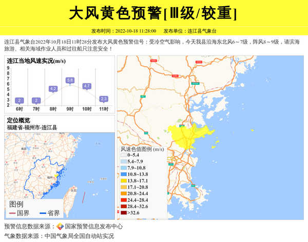 连江县气象台2022年10月18日11时28分发布大风黄色预警信号:受冷空气影响,今天我县沿海东北风6~7级,阵风8~9级,请滨海旅游、相关海域作业人员和过往船只注意安全! 信息来源:国家预警信息发布中心; 发布单位:连江县气象台。