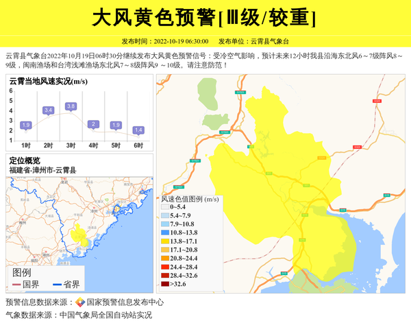 云霄县气象台2022年10月19日06时30分继续发布大风黄色预警信号:受冷空气影响,预计未来12小时我县沿海东北风6~7级阵风8~9级,闽南渔场和台湾浅滩渔场东北风7~8级阵风9 ~10级。请注意防范! 信息来源:国家预警信息发布中心; 发布单位:云霄县气象台。
