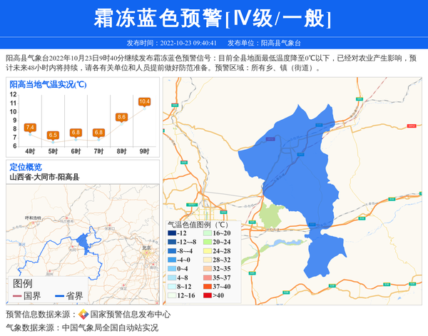 阳高县气象台2022年10月23日9时40分继续发布霜冻蓝色预警信号:目前全县地面最低温度降至0℃以下,已经对农业产生影响,预计未来48小时内将持续,请各有关单位和人员提前做好防范准备。预警区域:所有乡、镇(街道)。 信息来源:国家预警信息发布中心; 发布单位:阳高县气象台。