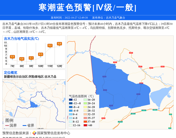 吉木乃县气象台2022年10月27日12时49分发布寒潮蓝色预警信号:预计未来48小时内,吉木乃县最低气温将下降8℃以上;29日和30日早晨,县城、恰勒什海乡、吉木乃镇最低气温将降至-6℃~-4℃,乌拉斯特镇、别斯铁热克乡、托斯特乡、喀尔交镇将降至-8℃~-5℃,山区将降至-18℃~-14℃。 信息来源:国家预警信息发布中心; 发布单位:吉木乃县气象台。