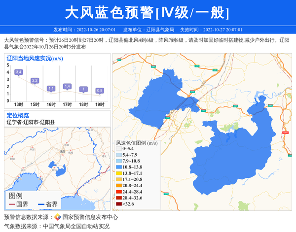 大风蓝色预警信号:预计26日20时到27日20时,辽阳县偏北风4到6级,阵风7到8级,请及时加固好临时搭建物,减少户外出行。辽阳县气象台2022年10月26日20时3分发布 信息来源:国家预警信息发布中心; 发布单位:辽阳县气象局。