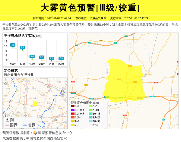 平乡县气象台2022年11月01日22时42分发布大雾黄色预警信号:预计未来12小时,我县全部乡镇将出现能见度低于500米的雾,局地能见度不足200米。请防范! 信息来源:国家预警信息发布中心; 发布单位:平乡县气象台。