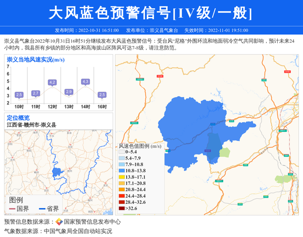 崇义县气象台2022年10月31日16时51分继续发布大风蓝色预警信号:受台风“尼格”外围环流和地面弱冷空气共同影响,预计未来24小时内,我县所有乡镇的部分地区和高海拔山区阵风可达7-8级,请注意防范。 信息来源:国家预警信息发布中心; 发布单位:崇义县气象台。