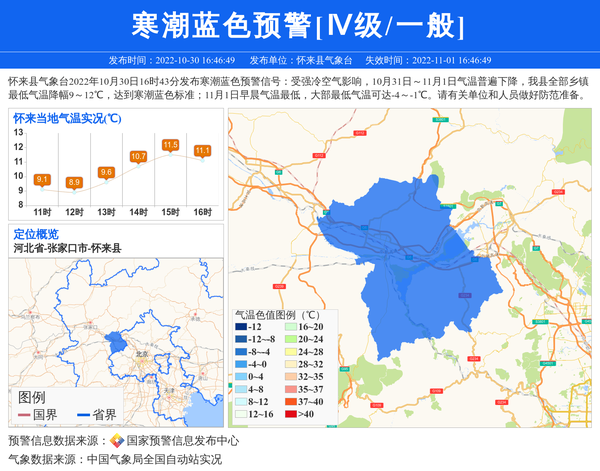 怀来县气象台2022年10月30日16时43分发布寒潮蓝色预警信号:受强冷空气影响,10月31日~11月1日气温普遍下降,我县全部乡镇最低气温降幅9~12℃,达到寒潮蓝色标准;11月1日早晨气温最低,大部最低气温可达-4~-1℃。请有关单位和人员做好防范准备。 信息来源:国家预警信息发布中心; 发布单位:怀来县气象台。