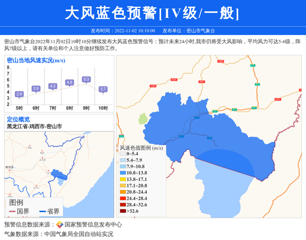 密山市气象台2022年11月02日10时10分继续发布大风蓝色预警信号:预计未来24小时,我市仍将受大风影响,平均风力可达5-6级,阵风7级以上,请有关单位和个人注意做好预防工作。 信息来源:国家预警信息发布中心; 发布单位:密山市气象台。