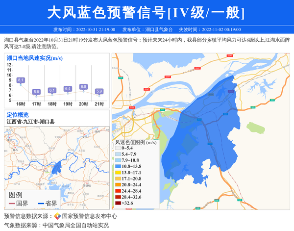 湖口县气象台2022年10月31日21时19分发布大风蓝色预警信号:预计未来24小时内,我县部分乡镇平均风力可达6级以上,江湖水面阵风可达7-8级,请注意防范。 信息来源:国家预警信息发布中心; 发布单位:湖口县气象台。
