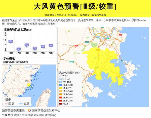 福清市气象台2022年11月01日22时20分继续发布大风黄色预警信号:受冷空气影响,未来12小时我市沿海东北风7~8级阵风9~10级,请出海船只、沿海作业和滨海旅游注意安全! 信息来源:国家预警信息发布中心; 发布单位:福清市气象台。