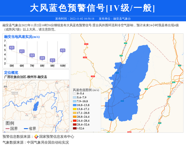 融安县气象台2022年11月2日10时58分继续发布大风蓝色预警信号:受台风外围环流和冷空气影响,预计未来24小时我县将出现6级(或阵风7级)以上大风,请注意防范。 信息来源:国家预警信息发布中心; 发布单位:融安县气象台。