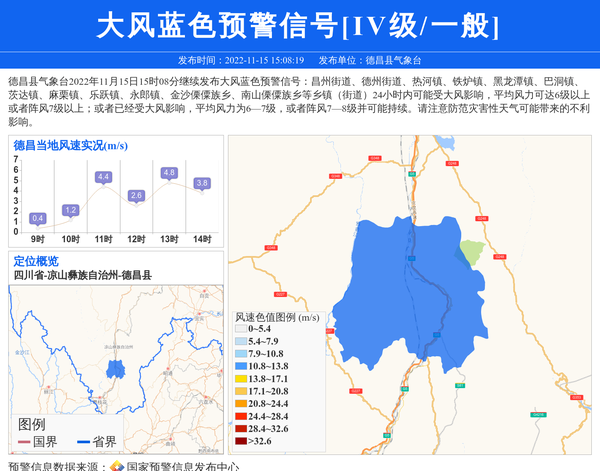 德昌县气象台2022年11月15日15时08分继续发布大风蓝色预警信号:昌州街道、德州街道、热河镇、铁炉镇、黑龙潭镇、巴洞镇、茨达镇、麻栗镇、乐跃镇、永郎镇、金沙傈僳族乡、南山傈僳族乡等乡镇(街道)24小时内可能受大风影响,平均风力可达6级以上或者阵风7级以上;或者已经受大风影响,平均风力为6—7级,或者阵风7—8级并可能持续。请注意防范灾害性天气可能带来的不利影响。 信息来源:国家预警信息发布中心; 发布单位:德昌县气象台。