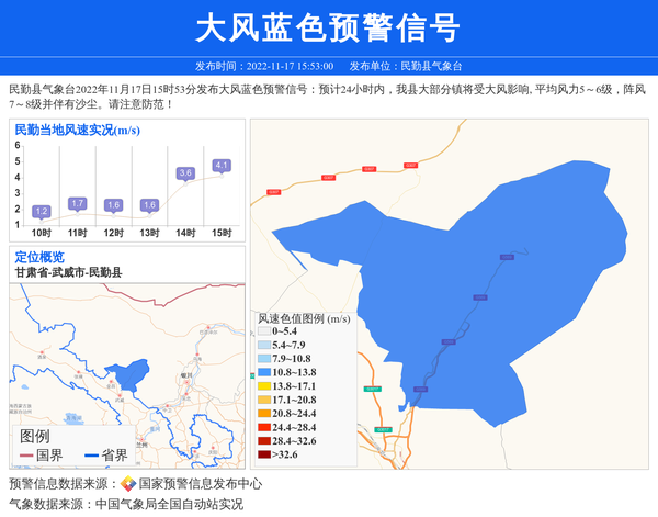 民勤县气象台2022年11月17日15时53分发布大风蓝色预警信号:预计24小时内,我县大部分镇将受大风影响, 平均风力5~6级,阵风7~8级并伴有沙尘。请注意防范! 信息来源:国家预警信息发布中心; 发布单位:民勤县气象台。
